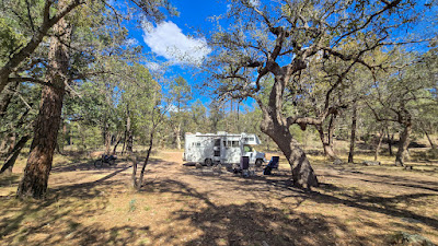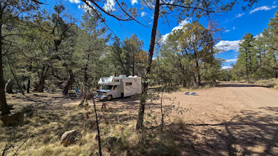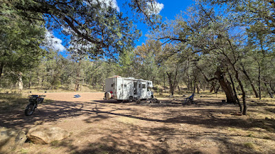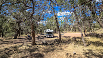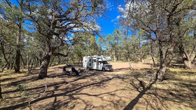 Je campe dans la forêt nationale de Coronado, et pour changer de rythme en Arizona, il y a des arbres ! En fait, c’est plus ombragé que je ne le souhaiterais puisque j’ai dû continuer à déplacer les panneaux solaires pour capter le soleil. Peut-être que je changerai d’avis à ce sujet une fois que la tendance au réchauffement reviendra après la vague de froid prévue pour demain.