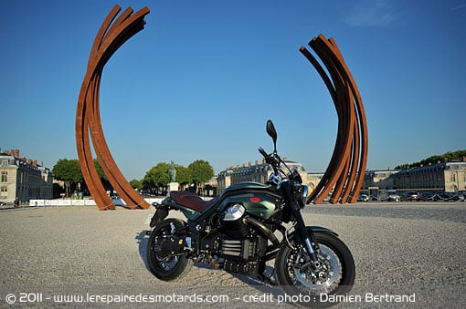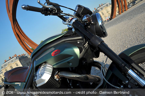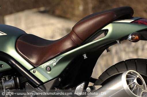 Difficile de poser un qualificatif d’emblée. Longue, voila le ressenti premier. Impression accentuée par un réservoir long et plat que prolonge une selle quasiment alignée sur la même ligne. Celle-ci se pare d’un coloris imitant le cuir, façon fauteuil «club». Associé au coloris spécifique vert «Tenni», le profane pourrait imaginer une machine venue d’Outre Manche !