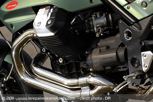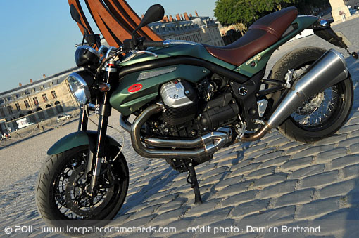 Apparue en 2005, la Griso est basée sur l’évolution du mythique bicylindre en V transversal de 1100 cm3. Sa cylindrée passe à 1200 cm3 et se dote de culasses 4 soupapes, en 2007, prenant la dénomination 8V. Retravaillé en profondeur en 2010, le twin se fait toujours plus sportif et démonstratif. Et dans sa livrée SE (Special Edition), ce modèle d’essai est aussi un ravissement pour les yeux. Le néo-rétro-sport : une nouvelle solution antidépresseur, venue d’Italie.