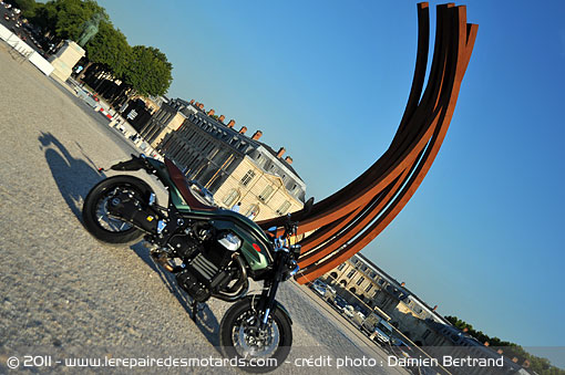 Les commandes de clignotants/klaxon sont inversées, occasionnant, au début seulement, quelques concertos pour avertisseur. Le bloc compteur se compose d’un large compte-tour et d’une fenêtre LCD. S’y regroupent d’habituelles fonctions à choisir au commodo de gauche selon 3 modes. Les deux premiers regroupent chacun odomètres partiels, temps de parcours, consommation moyenne, vitesse maximale et moyenne. Le troisième permet à l’utilisateur d’enclencher un chronomètre, vérifier la tension de batterie et paramétrer d’avantage la machine (choix du régime maxi pour le shiftlight, langage de l’affichage… etc.). Des possibilités inédites. S’affichent également le tachymètre, température extérieure, horloge et témoin de béquille déployée. Celle-ci est à la mode custom : positionnée loin en avant et massive. En revanche, pas de jauge de carburant ni d‘indicateur de rapport engagé. Ce dernier point n’a que peu d’importance, la 3e ou 4e vitesse permet de faire presque tout.