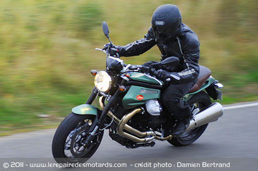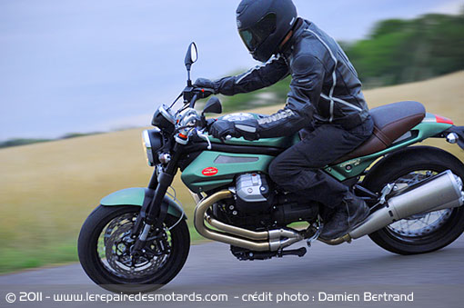 Quelques hectomètres lui sont nécessaires pour se chauffer parfaitement la voix. Le temps de prendre la mesure d’une force moteur prometteuse. La vrombissante italienne s’arrache prestement du bitume à chaque feux, obligeant son pilote à s’agripper fermement au guidon. Celui-ci ne facilite pas l’interfile étroite mais ne limite pas outre mesure les évolutions urbaines. Bien équilibrée de par un centre de gravité plutôt bas, la Griso dispose d’une direction légère. L’ensemble du train avant embarque toutefois l’équipage lors de demi-tour serré. Rien d’étonnant vue la longueur de la machine. Le rayon de braquage n’a, lui, rien à envier à celui d’une Triumph… plutôt correct pour l’Italienne. En revanche, l’injection peut générer des à-coups à froid ou en sous régime sur des rond points.