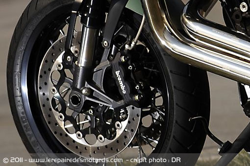 Un peu frustré, on saute alors sur les freins à étriers radiaux. Puissants, progressifs et endurants, ils se montrent tout à fait conformes à la philosophie et aux performances de la Griso, mais manquent un peu de mordant. L’arrière est plus délicat à doser et nécessite un effort plus constant, délivrant alors un fort ralentissement. Un simple réglage de levier devrait résoudre ce point.