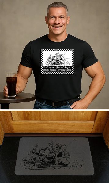 Comment un pilote Gold Wing accueille-t-il ses invités dans sa maison, sa caverne d’hommes, son garage ou son atelier d’une manière digne de son statut ? Avec un paillasson de haute qualité de GoldWing.us, bien sûr ! Le tapis de couleur anthracite accueille les invités avec le même dessin humoristique du célèbre dessinateur français BOD qui décore le T-shirt GoldWing.us.