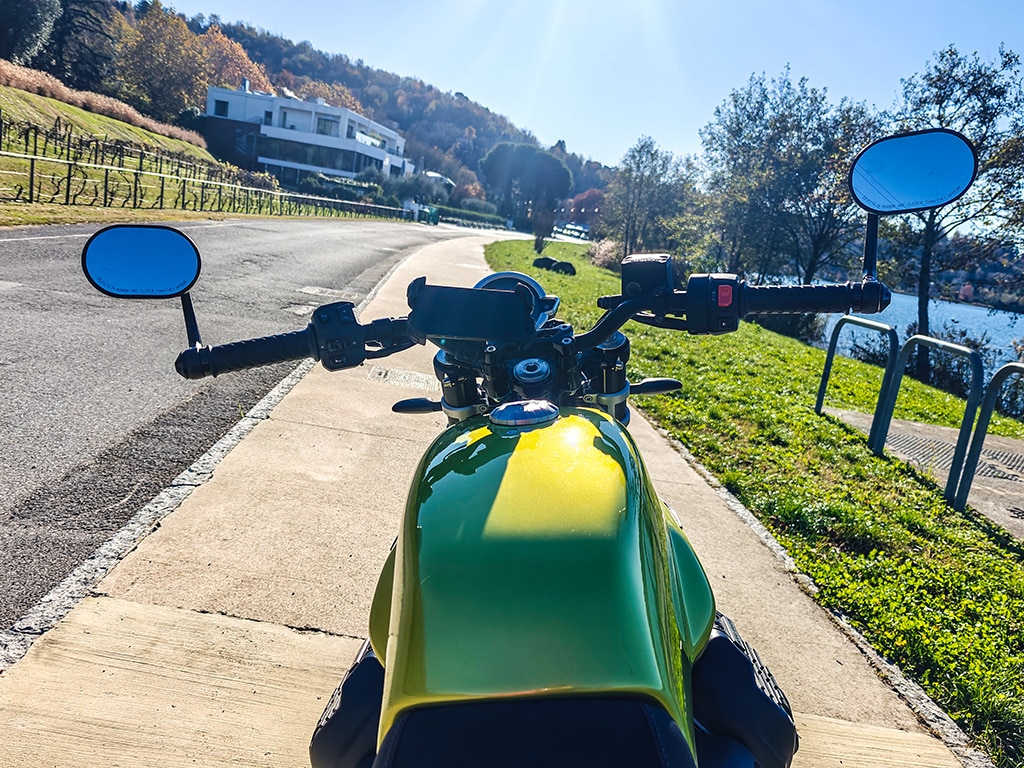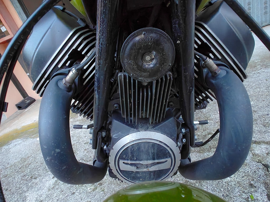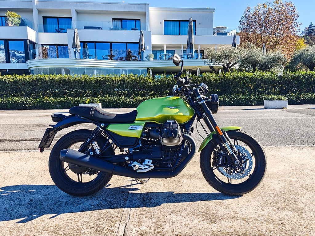 Il y a un aspect intéressant concernant la différence de rendu des couleurs entre les deux époques : le « vert citron » que l’on voit sur ces photos est certainement différent de celui du modèle des années 70, mais pourquoi ? Eh bien, Moto Guzzi a procédé à une sorte de « remasterisation » de la couleur, grâce à des recherches menées à l’aide d’un spectrophotomètre, car le code couleur de l’époque correspondait à des peintures qui ne peuvent plus être utilisées aujourd’hui.Le vert Legnano actuel, plutôt qu’une couleur de « moto de course » (d’où son nom), évoque davantage une couleur de voiture de sport moderne, mais l’effet reste exceptionnel, surtout sous la lumière du soleil. En somme, il a peut-être moins de profondeur, mais même plus de brillance de son prédécesseur. Autre différence : le noir dominant qui était absent auparavant. Désormais, des magnifiques jantes à rayons fins jusqu’au superbe moteur bicylindre 2025, presque tout est un déferlement de noir mat.
