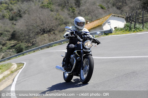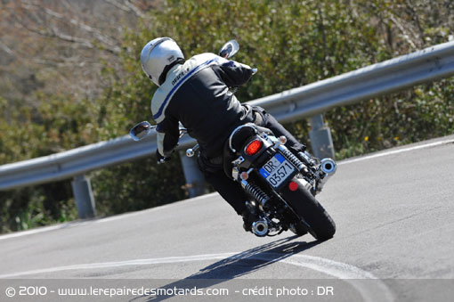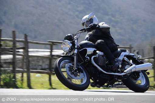 En route ! Le moteur s’ébroue gentiment faisant preuve d’une bonne discrétion. En raison de sa cylindrée relativement faible, le couple de renversement se fait peu sentir. Il est de facture très classique : un twin 2 soupapes refroidi par air et alimenté par une injection. Sa distribution culbutée lui autorise une puissance maxi de 48 ch à 6800 tr/mn, c’est modeste pour un 750 (3 fois moins qu’une GSXR !).