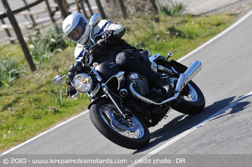 Ouf un peu de virage et du relief, ça va déjà mieux. La Nevada y révèle les qualités de son châssis. La tenue de cap est bonne et les « vrais custom » n’auront qu’à bien se tenir. La moto est légère (184 kg à sec plus un centre de gravité bas) et équipée de pneus étroits (110 av, 130 AR). De fait ça balance tout seul au premier battement de cils. Pas besoin de forcer, on enroule en douceur, comme avec une petite cylindrée. Décidément, à son guidon, en ville ou sur petite route  on a vraiment l’impression de conduire une 250 ou une 350. Autre bonne surprise : la garde au sol suffisante, compte tenu de la vocation de la machine et très correcte dans l’absolu. Mais si vous vous lancez à la poursuite d’un diamant vert (ou d’autre chose), vous découvrirez une boîte lente et les limites de la moto.