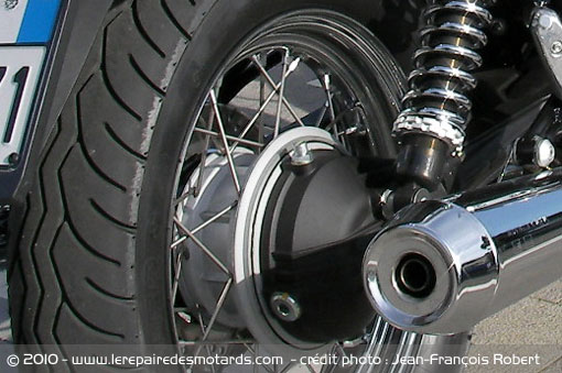 Pare-brise, pare-cylindres, béquille centrale, sacoches rigides, alarme, tout cela est disponible en option au catalogue du constructeur… moyennant finance. Dommage car elle n’est déjà pas donnée cette Guzzi (8390 €). Reste tout de même la transmission par arbre et cardan de série.
