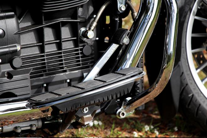 Pour plus de sportivité, la California Custom est équipée d’amortisseurs réglables en précharge et détente qui permettent aussi de légèrement rehausser la poupe. Leurs réservoirs séparés sont étonnamment liés par une durite en « liberté ». On regrette en revanche que les marche-pieds ne soient pas remplacés par des repose-pieds avancés ou médians plus classiques pour le design et pour la conduite.
